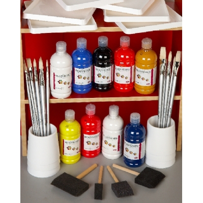 Remove the worry of choosing the right materials and keep this easy-to-order kit to hand in the classroom. Using paints as a creative form of expression is an important part of a child’s creative development. Devised with the help of Art Advisors this pack aims to provide a basic colour selection to encourage experimentation and colour mixing. The pack includes: 9 x 600ml bottles of essential colour-mixing Readymixed colours, 6 water pots, 6 palettes, 36 brushes and 4 sponge brushes.